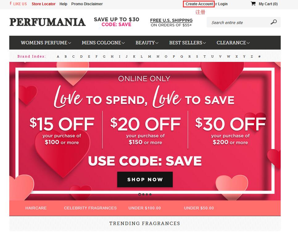 打开Perfumania官网:https://www.perfumania.com/,点击右上角“Create Account”进入新用户注册。