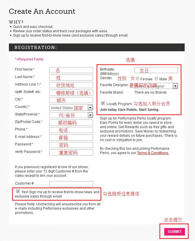 Perfumania的注册比较繁琐,要求填写地址,这里就直接填写转运地址即可。右边几项是选填的,不想弄的就忽略吧。不过建议填下生日,一般生日当天会送你独有的Perfumania优惠码。邮箱最好使用Gmail、Outlook这类国际邮箱。