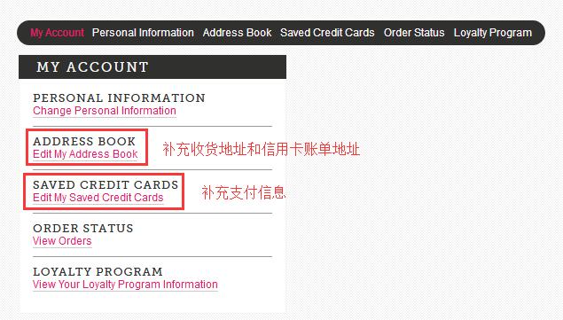 注册成功后,为让后续的购物更便捷,建议先完善收货地址,信用卡账单地址和支付方式这三类信息(也可以在结账时填写)。
