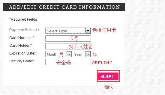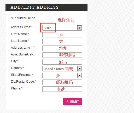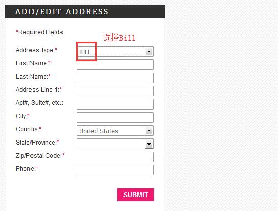 1)补充地址:收货地址和信用卡账单地址是在一个页面上的。通过第一行的“Address Type”来选择填写和保存。“SHIP”是收货地址,“BILL”是信用卡账单地址。注意一定不要写叉了!