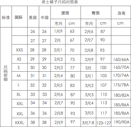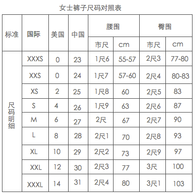 上述腰围指实际腰身尺寸,并不是裤子的尺码。