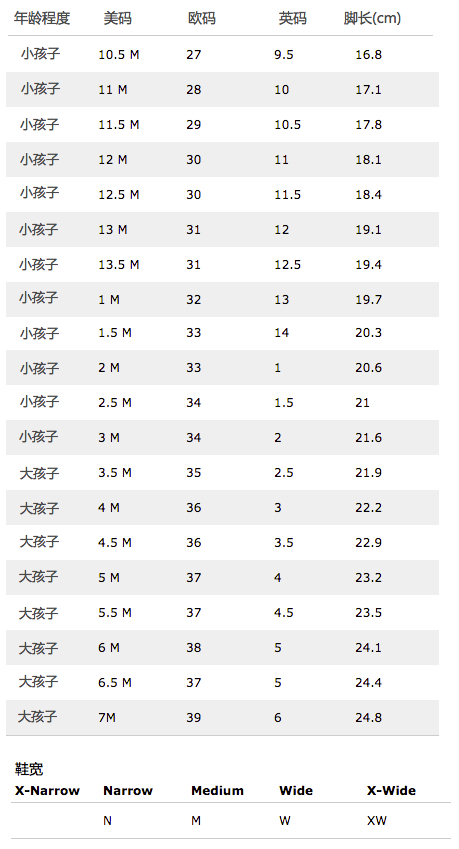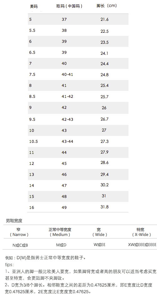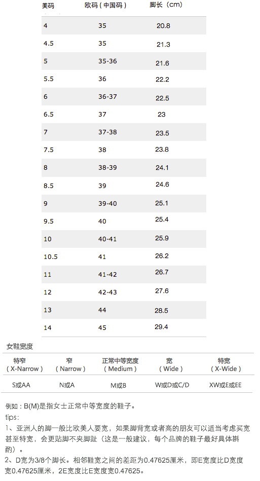 三、常用尺码对照表(尺码表仅供参考,具体以品牌尺寸为准)